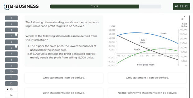 One task format that measures critical thinking and appears since the 1980s in aptitude tests for economics, business administration, and science, is called “Graphs and Tables” or “Interpreting Charts”. Test-takers receive numerical information (sometimes discipline-specific, sometimes interdisciplinary) plus an explanatory text, and then must judge whether statements are supported by the data. Importantly, some statements may feel highly plausible but are not supported by the information given. The figure shows a Graphs & Tables item of an ITB-Business prep test.